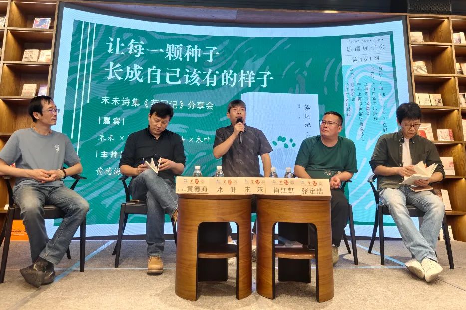 從左至右為黃德海、木葉、末未、肖江虹、張定浩 撰稿:陸銘暉 6月15日下午,詩人末未攜其詩集《菜園記》與作家肖江虹、評論家張定浩、評論家木葉一起做客思南讀書會第461期,談論一塊菜地如何催生了詩歌,以及末未寫詩的性情和選......